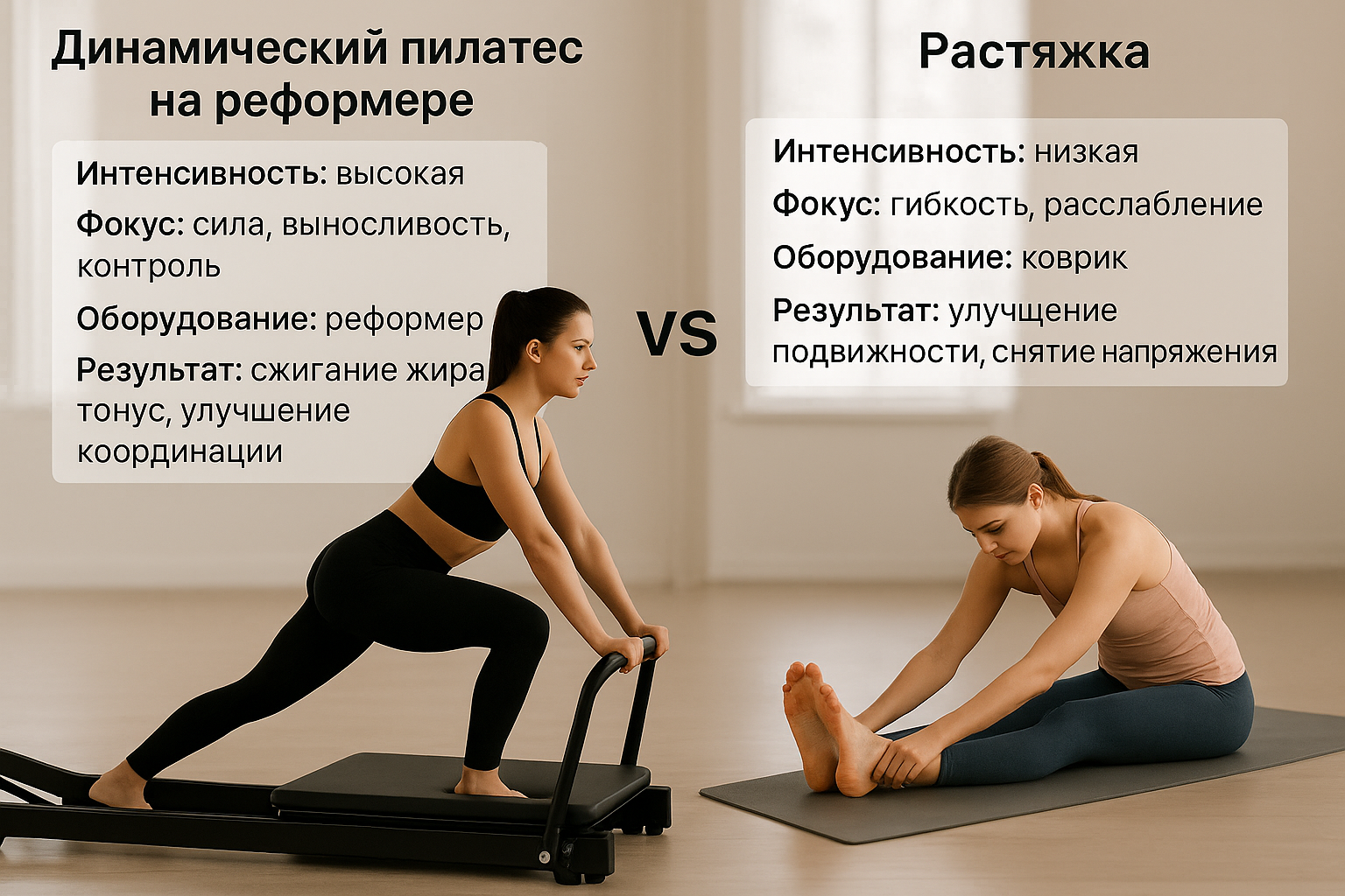 Силовой реформер — это активная силовая тренировка с элементами статики и координации. Он больше про нагрузку, силу и контроль.